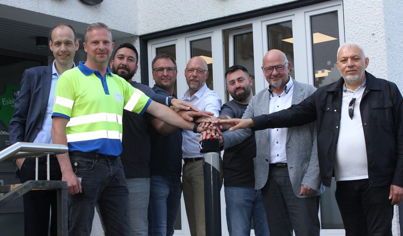 Bildunterschrift: Inbetriebnahme des Glasfasernetzes in Eslohe Kernort: Ab sofort können Bürger*innen und Gewerbetreibende ihre Glasfaseranschlüsse nutzen und schnell, stabil und nachhaltig im Internet surfen. Auf dem Foto (v. l.): Stefan Lange (Kommunalmanager Westenergie), Christian Holterhoff (Projektleiter Westnetz), Ismail Cetin (Geschäftsführer Albatros Baugesellschaft mbH), Thomas Funke (Gemeinde Eslohe), Heiko Grebe (Regionalmanager Westconnect), Tanju Acik (Geschäftsführer Albatros Baugesellschaft mbH), Stephan Kersting (Bürgermeister Gemeinde Eslohe), Mustafa Altinok (Geschäftsführer Albatros Baugesellschaft mbH)
