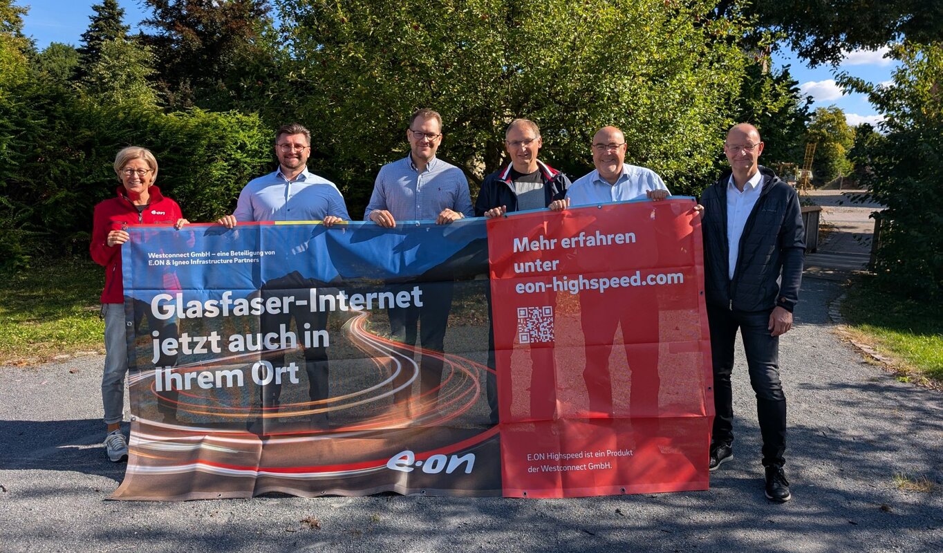 Bildunterschrift: Westconnect plant den Ausbau eines Glasfasernetzes in Warstein. Eigentümer*innen haben die Möglichkeit, einen kostenlosen Glasfaseranschluss für ihre Immobilie zu erhalten. Auf dem Foto (v. l.): Elisabeth Barg (E.ON), Peter Sosna (Westconnect), Fabian Wälter (Westenergie), Christian Lenze (Ortsvorsteher-Niederbergheim), Dr. Thomas Schöne (Bürgermeister), Dirk Risse (Leiter Wirtschaftsförderung). (Foto: Westconnect)