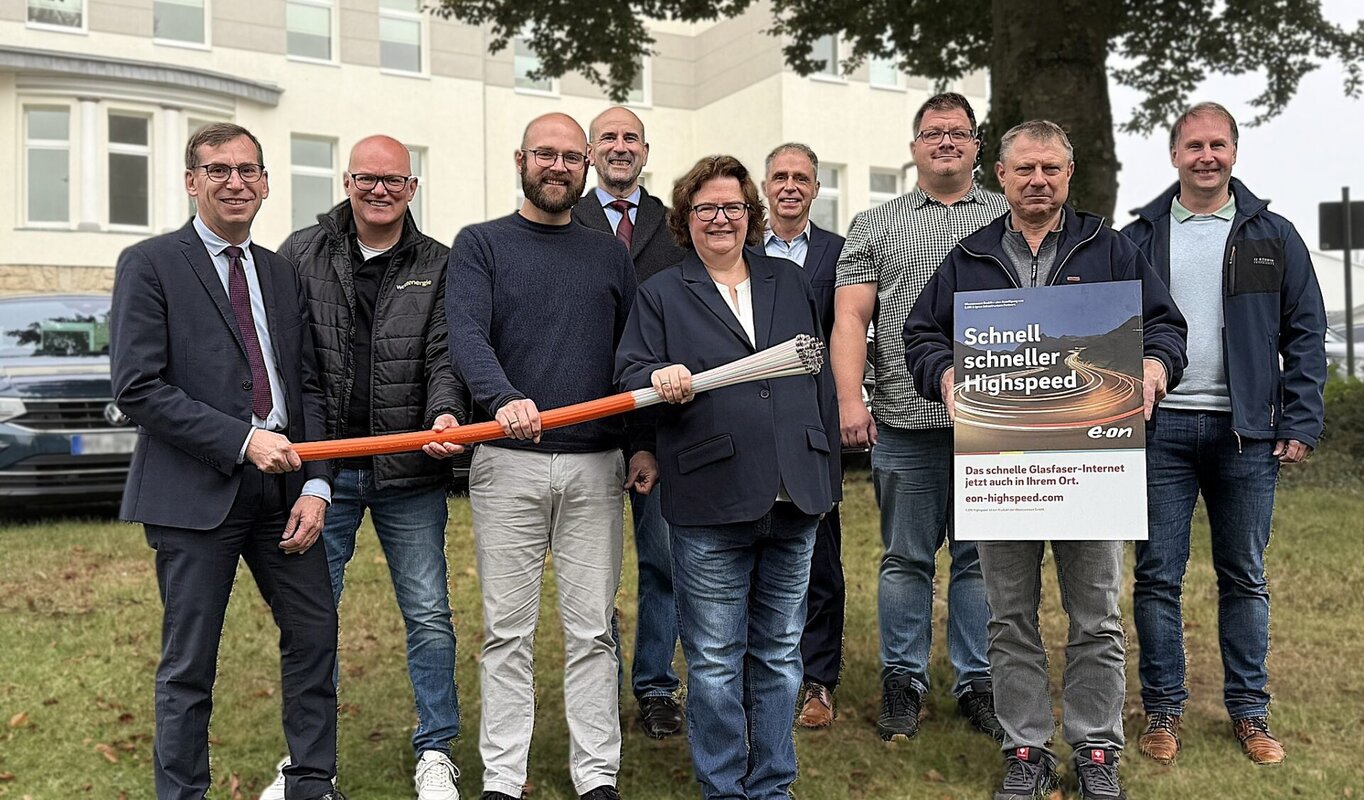 Bildunterschrift: Der derzeitige Ausbau des Glasfasernetzes durch die Westconnect GmbH ermöglicht Haushalten und Betrieben in Warburg Zugang zu schnellem, stabilem und nachhaltigem Internet. Auf dem Foto (von links): Warburgs Bürgermeister Tobias Scherf, Thorsten Hillebrand (Kommunalmanager bei Westenergie), Eric Volmert (Stadt Warburg: Bauen und Stadtentwicklung), Andreas Reiche (netcom Kassel: Technikregulierung), Birgit Büscher (Westconnect: Managerin Regionale Kooperationen), Heinrich König (netcom Kassel: Betreuung Carrier-Vertrieb und Geschäftskunden), Ansgar Bodemann (Ortsvorsteher Warburg-Calenberg), Hermann-Josef Dierkes (Koordinator Breitbandausbau Stadtwerke Warburg) sowie Alexander Neumann (Ortsvorsteher Warburg-Herlinghausen). (Foto: Hansestadt Warburg)