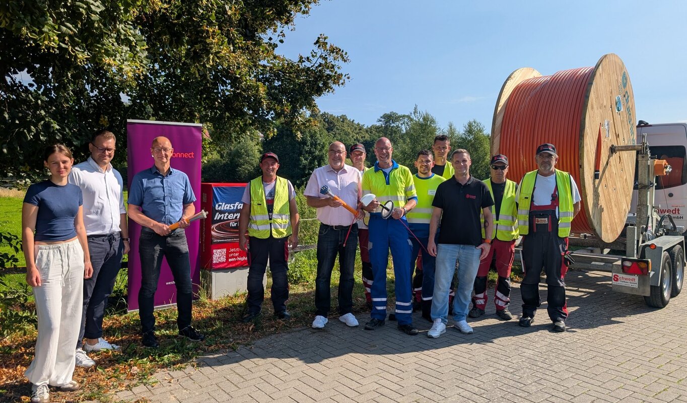 Spatenstich in Warstein-Belecke: Westconnect bringt Glasfasernetze in die Stadt Warstein. Ab der kommenden Woche baut das Unternehmen Glasfaserleitungen, die bis ins Gebäude gelegt werden, im Ortsteil Belecke aus. Damit ermöglicht Westconnect weiteren Haushalten und Betrieben Zugang zu schnellem, stabilem und nachhaltigem Internet. Mit dem Ausbau sind die Privathaushalte sowie Gewerbetreibenden zukunftssicher aufgestellt: Das neue Glasfasernetz bietet Übertragungsraten von bis zu 1.000 Megabit pro Sekunde.
